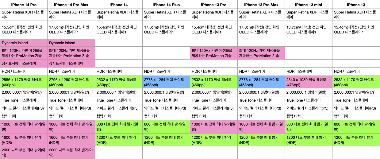 이와중에 아이폰 13 mini 의 해상도가 476ppi 로 의미없는 차이기는 하지만 아래 표에서 가장 높은 밀도를 가진 것을 알 수 있다.