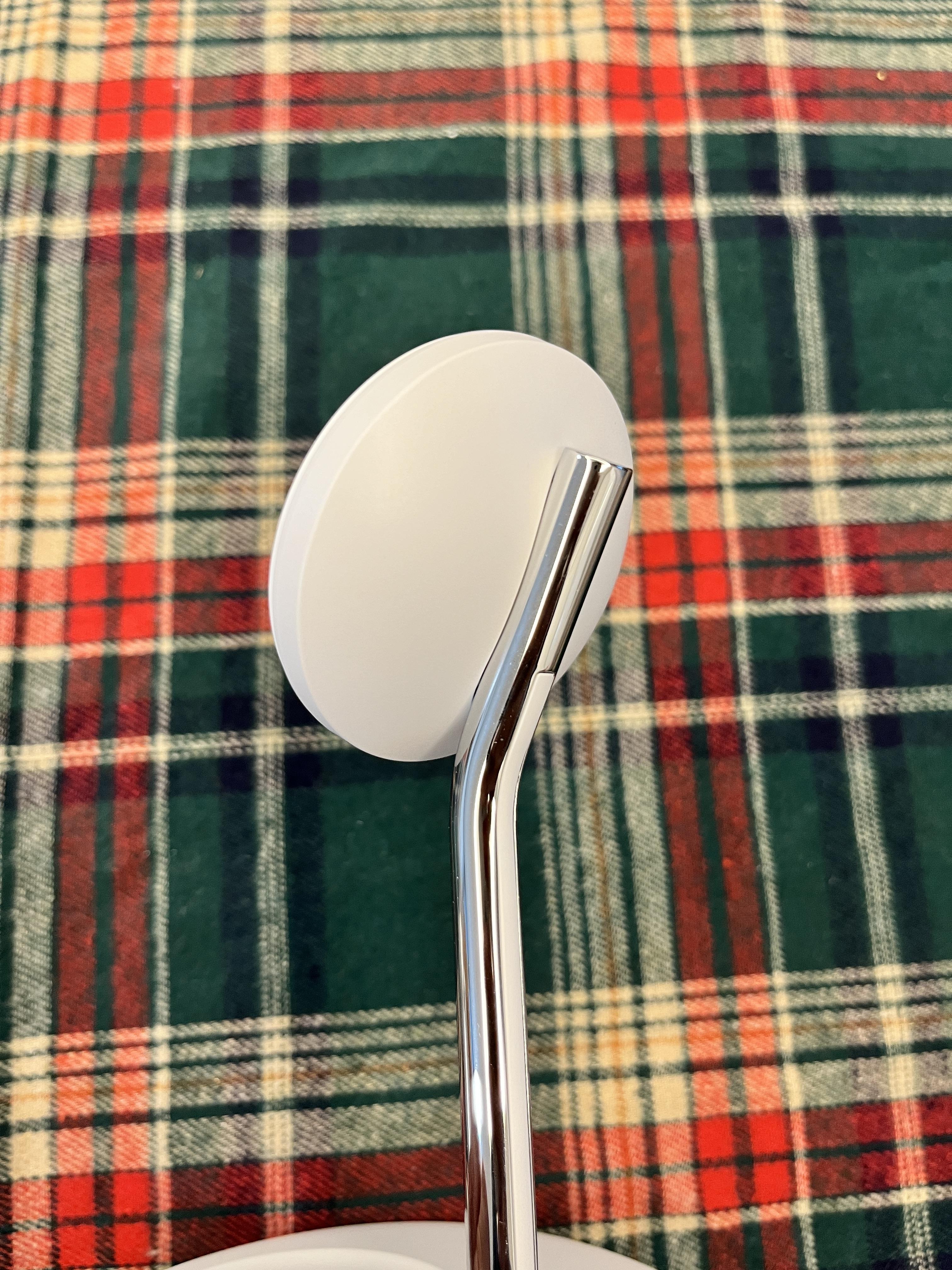 튼튼한 원판 바닥에 스테인리스 소재처럼 금속 색을 띄는 기둥.