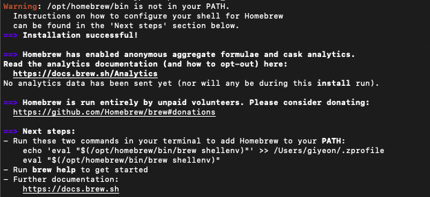 바로 Homebrew 가 path 에 존재하지 않는다는 Warning 을 해결하기 위한 단계다.