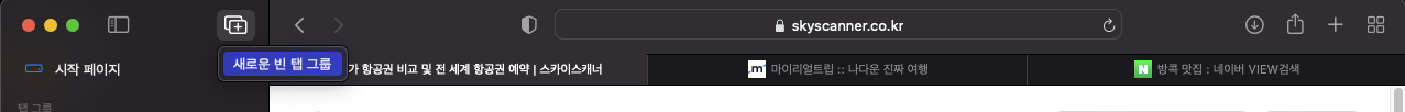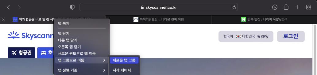 '이 3개의 탭을 '여행'이라는 이름의 탭그룹으로 묶을 수 있다.